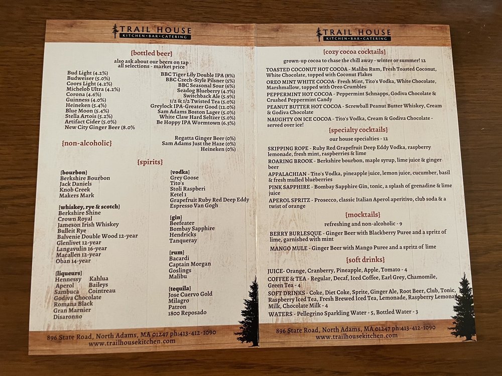 Welcome to Trail House Kitchen & Bar, a delightful culinary gem situated at 896 State Rd, North Adams, MA. This vibrant venue specializes in New American cuisine featuring an array of seafood and hearty fare. It's a place where casual dining meets a warm, intimate atmosphere—perfect for family dinners or lively gatherings with friends.